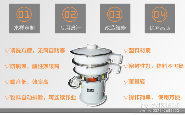塑料振動(dòng)篩粉機(jī)是河南大漢機(jī)械在總結(jié)多年工作經(jīng)驗(yàn)、結(jié)合國內(nèi)振動(dòng)篩生產(chǎn)廠家具體工況條件而研制的尼龍網(wǎng)耐酸堿振動(dòng)篩設(shè)備。我公司設(shè)計(jì)研發(fā)的塑料振動(dòng)篩粉機(jī)是專門針對(duì)解決一些特殊物料與Q235普通碳鋼及SUS304不銹鋼材質(zhì)接觸后容易產(chǎn)生氧化、腐蝕等問題。是目前有效解決具有氧化、腐蝕鋼鐵材質(zhì)的物料篩分、除雜、過濾的方案,并且確保了物料在篩分過程中不會(huì)變質(zhì)。塑料防腐振動(dòng)篩是目前有氧化、腐蝕鋼鐵材質(zhì)特性物料篩分、除雜、過濾有效的解決方案。