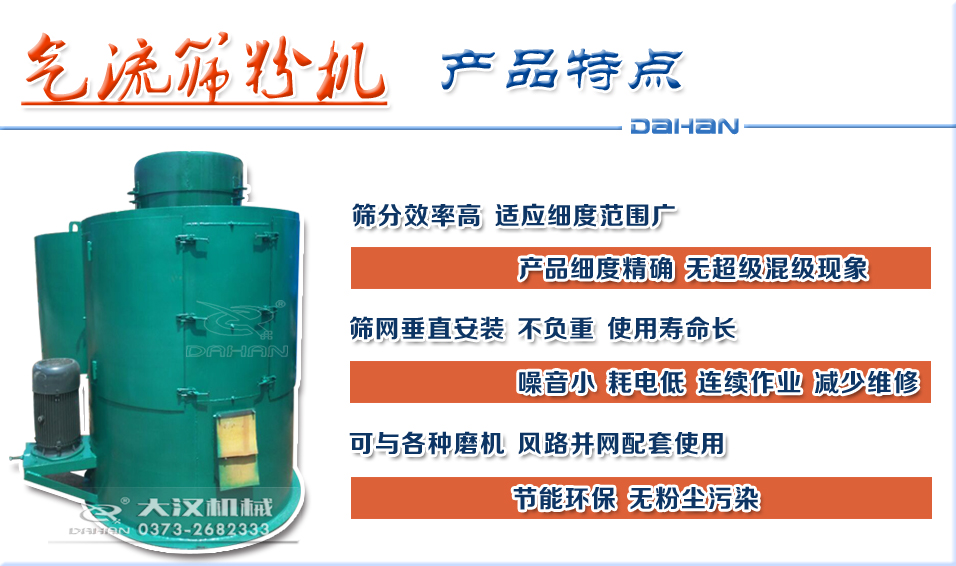 立式氣流篩粉機(jī)是新型高效篩粉設(shè)備,適合80-530目有網(wǎng)各種粉狀物料篩選分級(jí),其篩分效率高、產(chǎn)量大、自動(dòng)進(jìn)料排料、連續(xù)作業(yè)、無(wú)污染,使以往用各種振動(dòng)篩難以進(jìn)行高細(xì)度精密篩分作業(yè)成為易事。經(jīng)過(guò)對(duì)120-180目輕鈣、300目重鈣、400目活性鈣、300目山楂粉、320-500目鋅粉、500目氧化鐵黑、氧化鐵紅、120-160目中藥粉、180-270目石英粉等物料的篩分使用,測(cè)得每平方米篩網(wǎng)面積每小時(shí)產(chǎn)量均在一噸左右,同時(shí)測(cè)得篩分效率在95%以上,空氣含塵量低于10mg/m3。